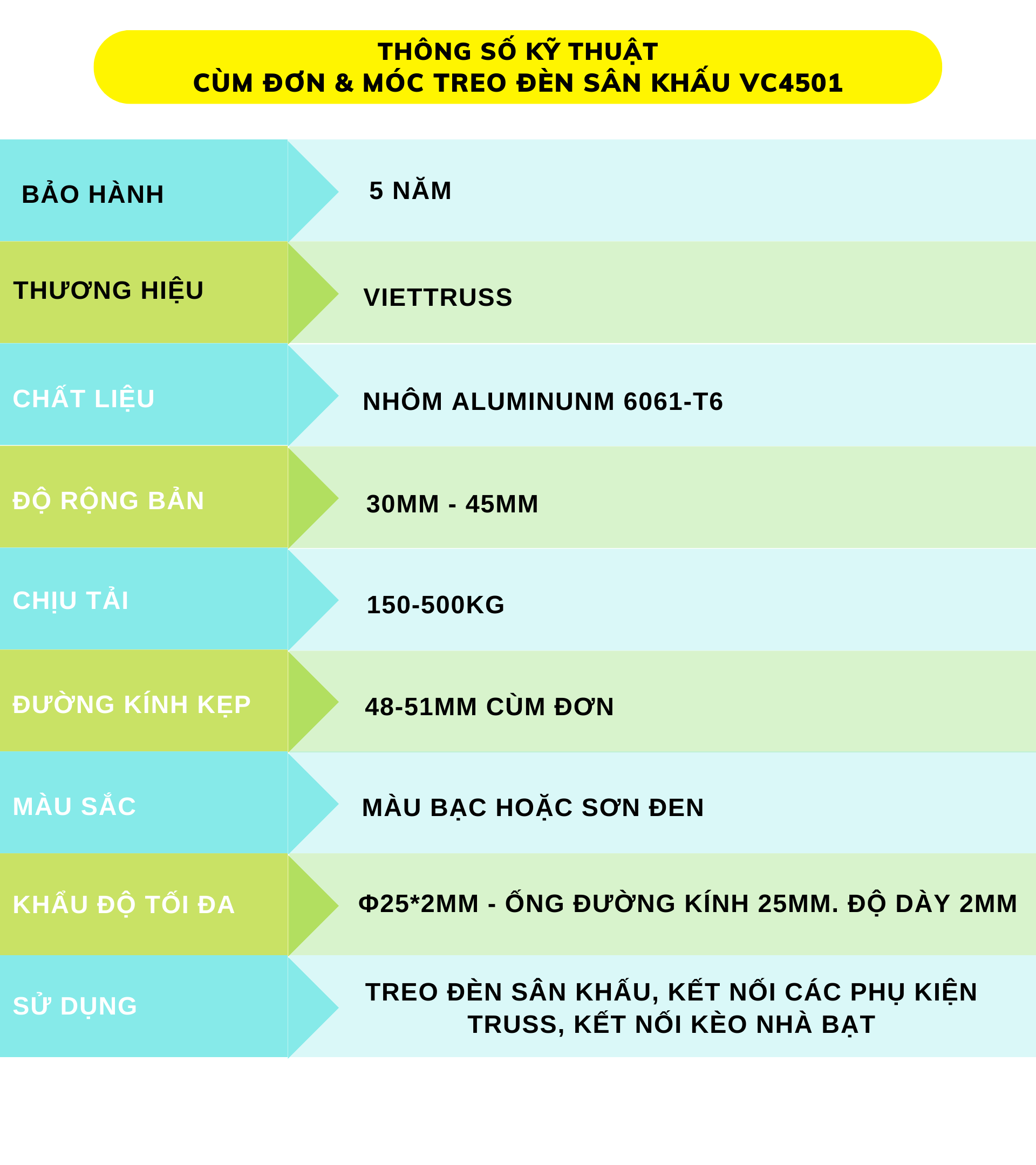 ✅ THÔNG SỐ KỸ THUẬT CÙM ĐƠN & MÓC TREO ĐÈN SÂN KHẤU VC4501