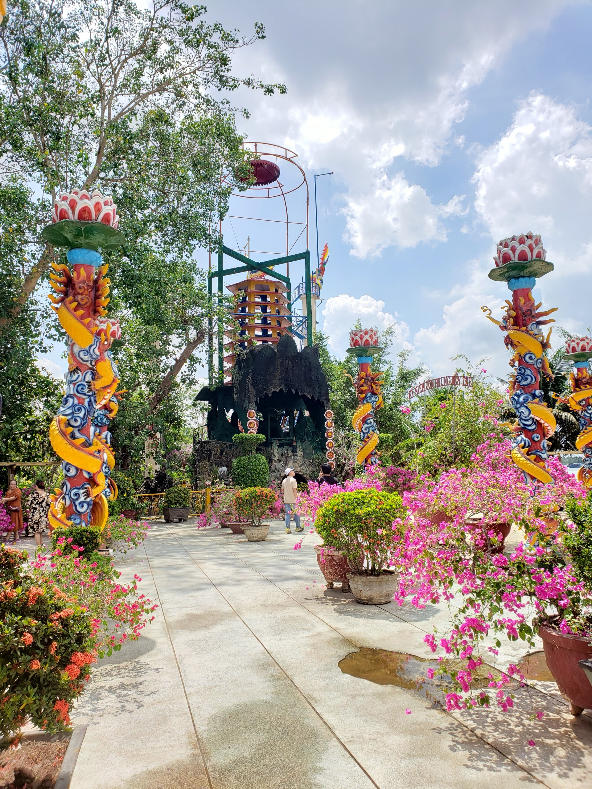 The first destination on the trip was Vinh Trang Pagoda, a pagoda built by Mr. and Mrs. Bui Cong Dat in the early 19th century. The pagoda was built by the architectural work of many people, over many years, and is a large pagoda. , is designed quite sophisticatedly and diversely according to the synthetic Asian - European architectural style (French, Roman, Thai, Cambodian, Cham). However, the pagoda still bears the bold traditional Vietnamese sculptural architecture.