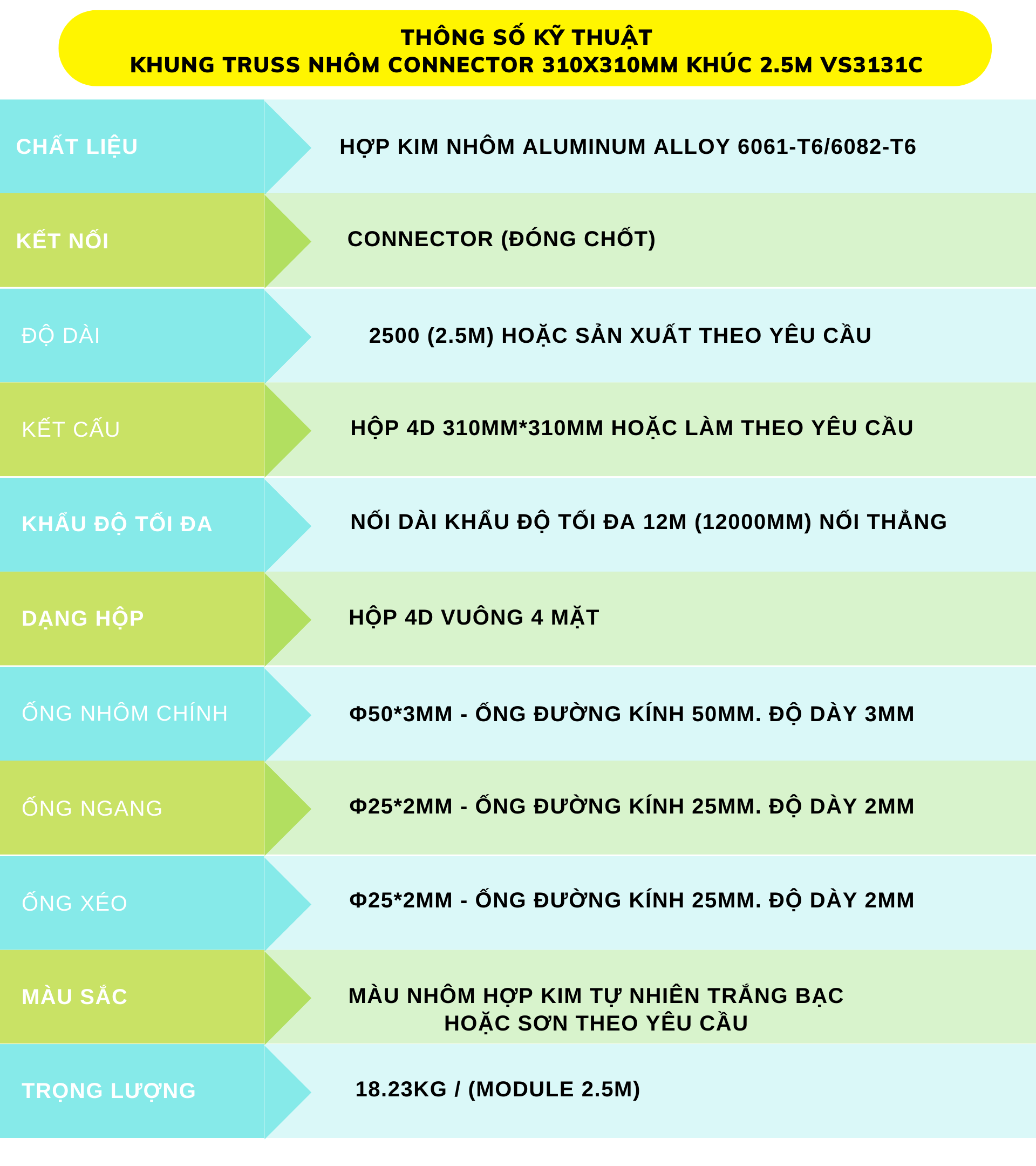 Specifications truss aluminum frame connector 310x310mm section 2.5M VS3131C